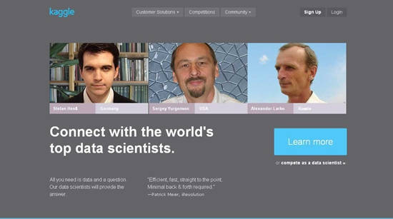 Kaggle是全球最大的数据科学家社区,也是一个数据挖掘与预测模型竞赛平台。截至2013年6月,已经有10.36万名数据科学家进驻该平台。平台对所有数据科学家免费开放,而对竞赛发起方收取一定服务费。其服务领域包括生命科学,金融服务,能源,IT和零售等行业。起初Kaggle只是一个数据科学竞赛发起公共平台,发起人可以在平台上发起难题竞赛,来自世界各地的数据科学家参与竞赛并从中决出最优者,最优者将获得一定奖励,而Kaggle对发起人收取一定服务费。最近Kaggle推出了Kaggle Connect咨询平台,它可以帮助有难题的客户找到最适合的数据科学家。而这些候选人来自Kaggle社区中排名前千分之五的数据科学家(约500名)。