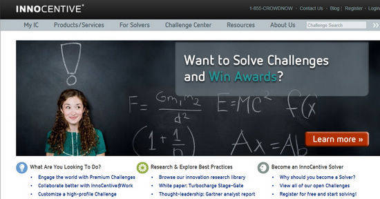 InnoCentive是一个众包创新研究平台,在网站上注册的“解决者”,通过行之有效的挑战方式和云技术支持,以及快速解决方案和可持续开放创新项目的参与,可以帮助客户实现创新成果向经济效益转化。大公司可以在平台上张贴挑战,而解决者可以访问、评估或提交解决方案,方案最优者将得到5000美元到100万美元不登的现金奖励。截至2013年6月1日,该平台拥有来自近200个国家的30万名注册“解决者”,平台上张贴有1600多个外部挑战和成千上万个内部挑战,平均获奖率为74%,累计颁发奖金达4000万美元。