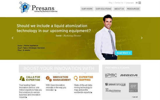 Presans是开放式创新服务的新生代代表,其人才网络有100万名权威专家。服务对象主要是中大型企业、大学和研究机构,研究领域集中于工业部门(航天、航空、国防、汽车制造业、能源与环境、力学、材料或信息技术)。该平台帮助客户对接其专家库,为他们提供多样化的服务,例如:寻找突破性技术、新技术的产业化、外国市场分析、寻找合作伙伴,产品研发等。