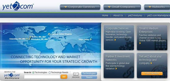 Yet2.com是一个基于开放创新服务的全球性技术交易平台,任何技术交易都可以在yet2.com上进行,目前该在线平台的用户已超过13万。Yet2.com的业务主要有:战略目标搜索,战略交易流服务(该平台的特色服务,每年向客户提供多达400条经过预先筛选的潜力公司及技术的介绍),授权技术市场化、业务发展,专利交易,创意提交门户和风险投资。其客户包括波音,福特和孟山都等公司。
