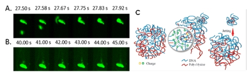 图1:dsDNA与PLL形成的复合物微滴在电场下发生了(A)选择性吸附和融合,以及(B)释放小粒子的行为,(C)为机理图(Chem.Commun.,2015,51,1506)。