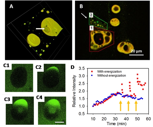 图2:ss-oligo与PLL形成的复合物液滴在电场下的动态行为。(A)内部分区的三维重建结果;(B)在分区化过程中释放富含PLL的小尺寸粒子;(C)复合物在电场存在下有选择地从外部环境中定向摄取小分子,C1至C4所示分别为1,15, 30和45秒时刻的截图,标尺为10 µm;(D)在特定时间施加1分钟电场对酶级联反应产生的脉冲式增强效果(Nat.Commun.,2016,doi:10.1038/ncomms10658)。