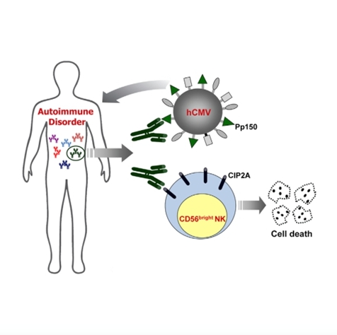 过往研究发现hCMV与类风湿关节炎(RA)、系统性红斑狼疮(SLE)、干燥综合征(pSS)等自身免疫病的发病相关,但其机制不清。本研究利用噬菌体展示技术从RA、SLE和pSS血清中发现了一种新的特异性抗体,可能由hCMV中的pp150蛋白诱导产生。该抗pp150抗体可以识别CD56bright自然杀伤细胞(NK)表面的肿瘤抑制蛋白CIP2A,诱导补体依赖的细胞毒作用,杀伤人的CD56brightNK细胞,导致患者体内NK细胞减少,而NK细胞失衡是导致自身免疫病发病的重要机制。