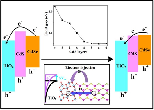 最近北大新材料学院的潘锋教授团队与中国科学院化学研究所林原教授团队合作,通过第一性原理和实验发现,TiO2/CdS/CdSe QDSSCs的光电转化性能可以通过液相原子层技术调控CdS缓冲层的原子层数来实现,最高效率能达到6%,接近该体系目前最高水平(6.01%)。他们发现随着CdS层数的增加,一方面CdS的带隙减小,CdS的导带底向下移动;另一方面,TiO2/CdS界面偶极作用增强,更多电子注入TiO2,导致TiO2的导带底向上移动,从而导致界面处各自的能级发生重排。因此,QDSSCs的开路电压和短路电流可以通过调控缓冲层的层数实现。这些发现将为以后如何优化缓冲层的界面性质来提高QDSSCs的表现性能提供重要的线索和指导。该工作近期发表在国际著名期刊Chemical Communications发表(DOI: 10.1039/C6CC01664B),北大新材料学院的张丙凯、郑家新以及中科院化学所李晓宁博士是文章的共同第一作者。潘锋教授和林原教授是共同通讯作者。
