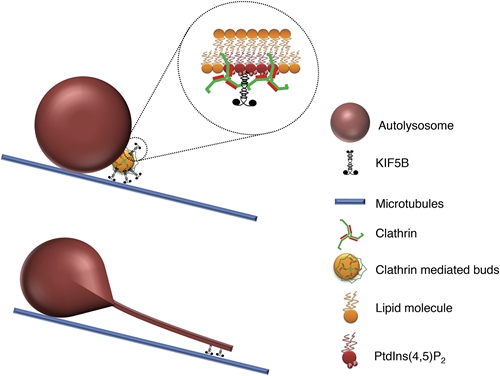 2016年5月23日,生命科学学院生物动态光学成像中心孙育杰研究组与清华大学生命学院俞立研究组合作在Developmental Cell发表论文Kinesin 1 drives autolysosome tubulation(驱动蛋白介导自噬性溶酶体出管),文章通过在体外重构自噬性溶酶体出管的单分子研究体系详细解析了驱动蛋白KIF5B介导自噬性溶酶体出管再生的分子机制。研究发现网格蛋白调控自噬溶酶体膜上PtdIns(4,5)P2聚集成微区,KIF5B通过与PtdIns(4,5)P2的直接相互作用而被招募到PtdIns(4,5)P2微区处,随后通过KIF5B的驱动蛋白性质,拉动了自噬溶酶体管状结构的生成。此项研究成果可能揭示了一个生物膜系统中普遍存在的由驱动蛋白介导的膜形变机制。