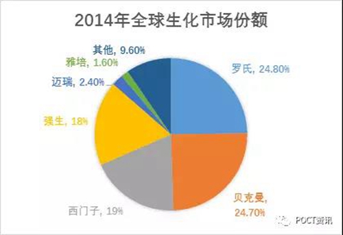 全球生化诊断市场半壁江山被罗氏和贝克曼·库尔特(丹纳赫)所占据,前四家占据85%的份额。