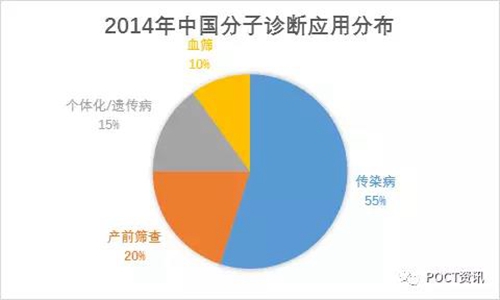 国内分子诊断应用最广是传染病,占整个分子诊断超过50%市场份额。产前筛查是另一块重要市场,占20%。伴随二胎政策放开,产筛未来会有较大增长空间。